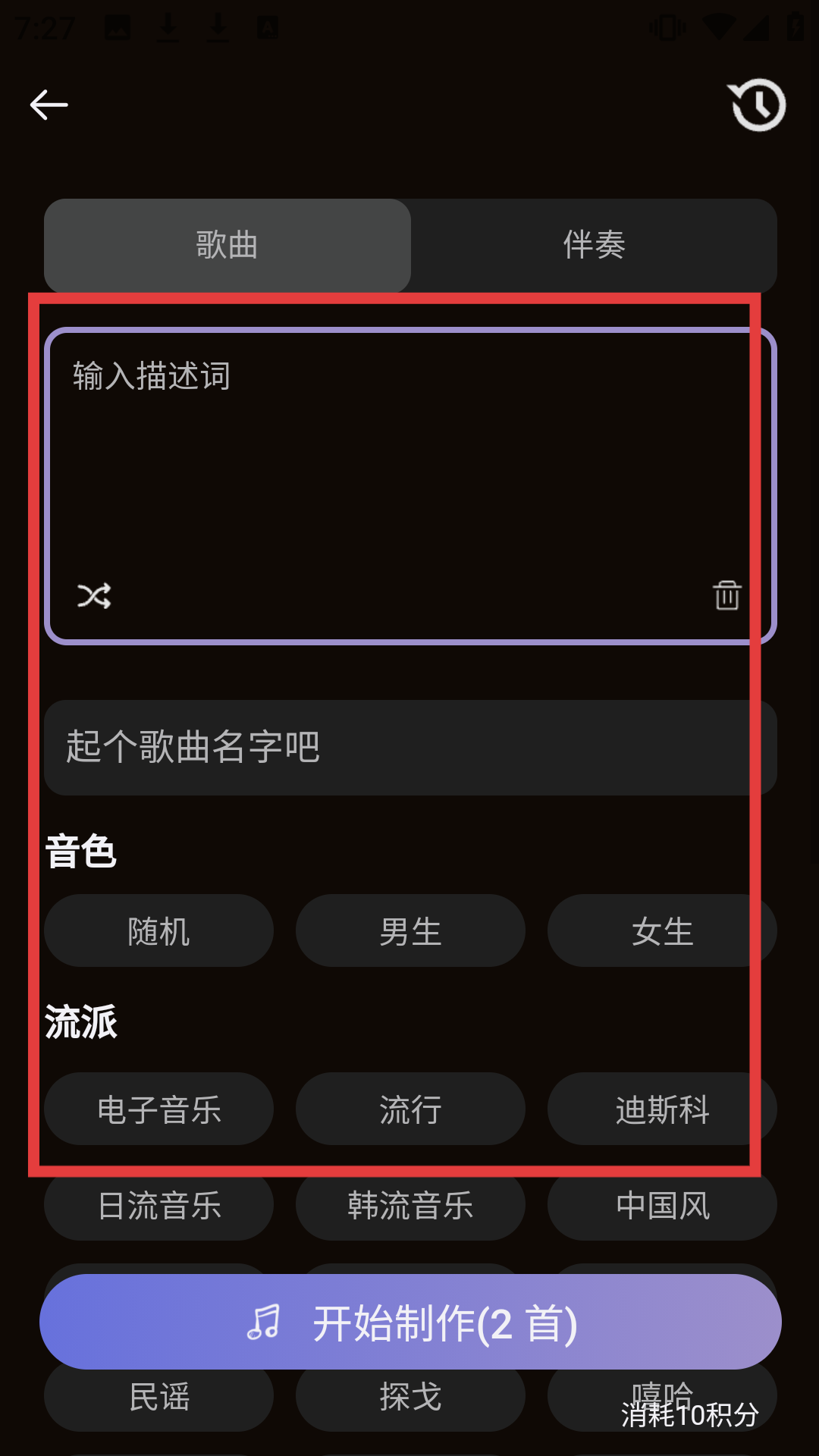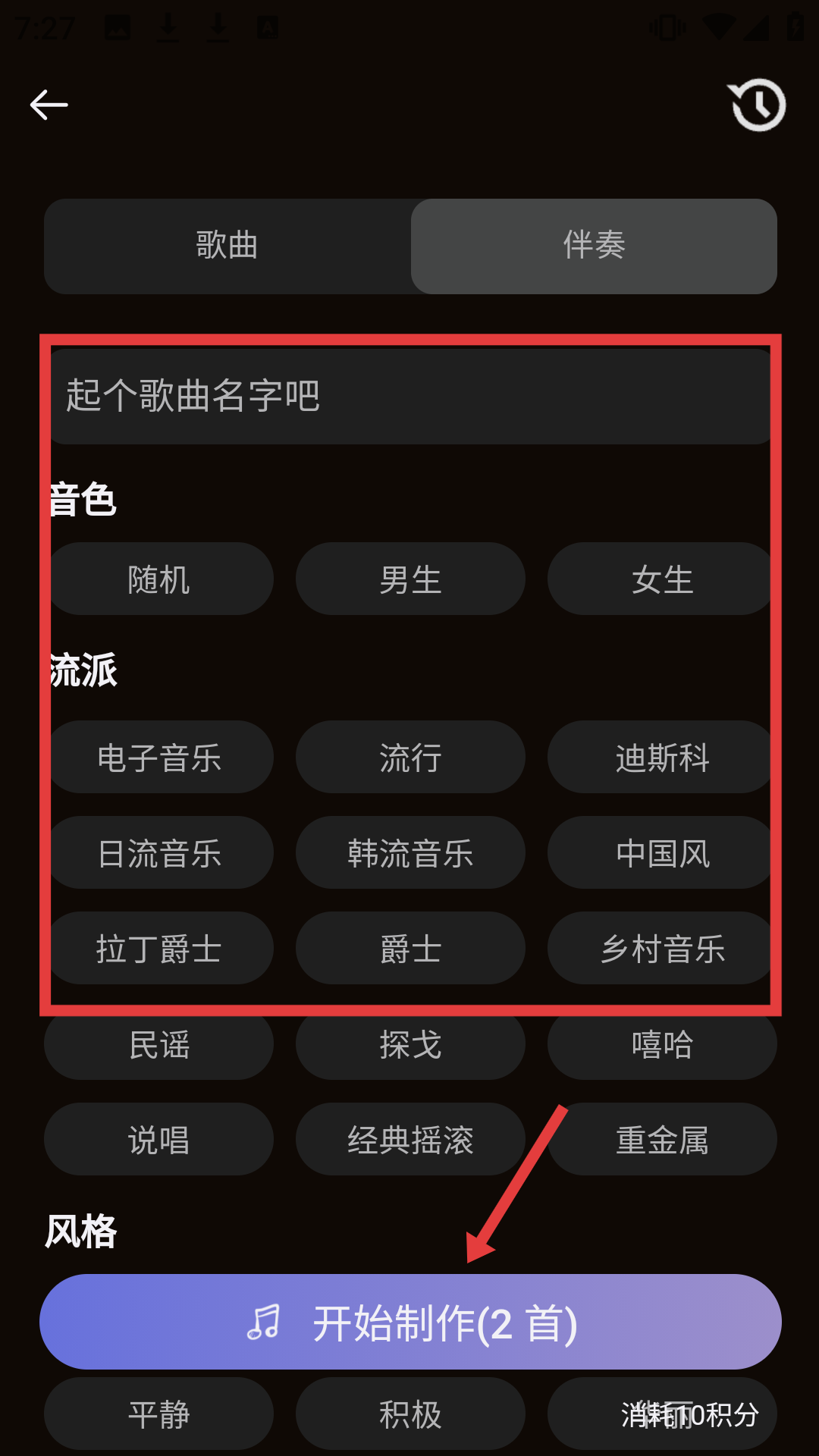 4、也能直接选择流派,如电子音乐、流行、中国风等,选好后点击开始制作2首,即可生成对应风格的音乐。
