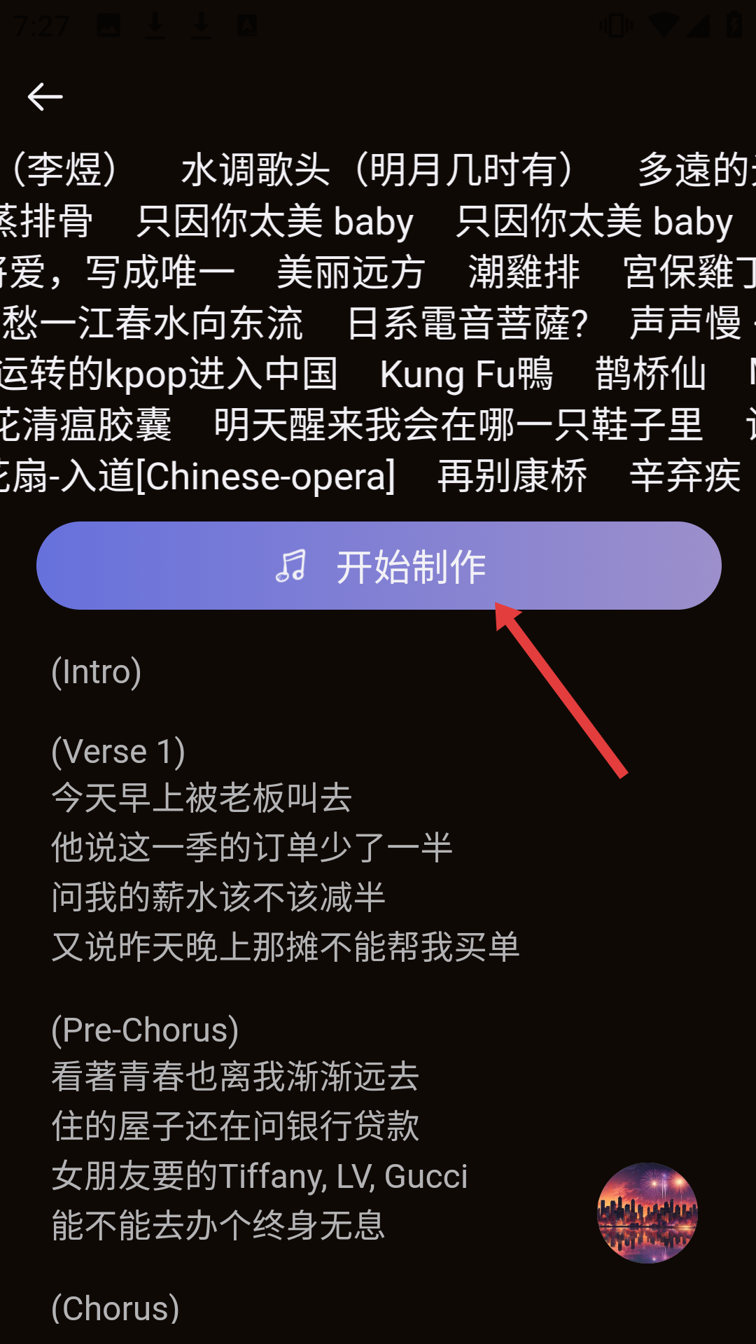 2、找到音乐或者选择更多进入,AI会自动生成创作好歌词,用户点击开始制作,就能进入后续将歌词与音乐结合的创作环节。