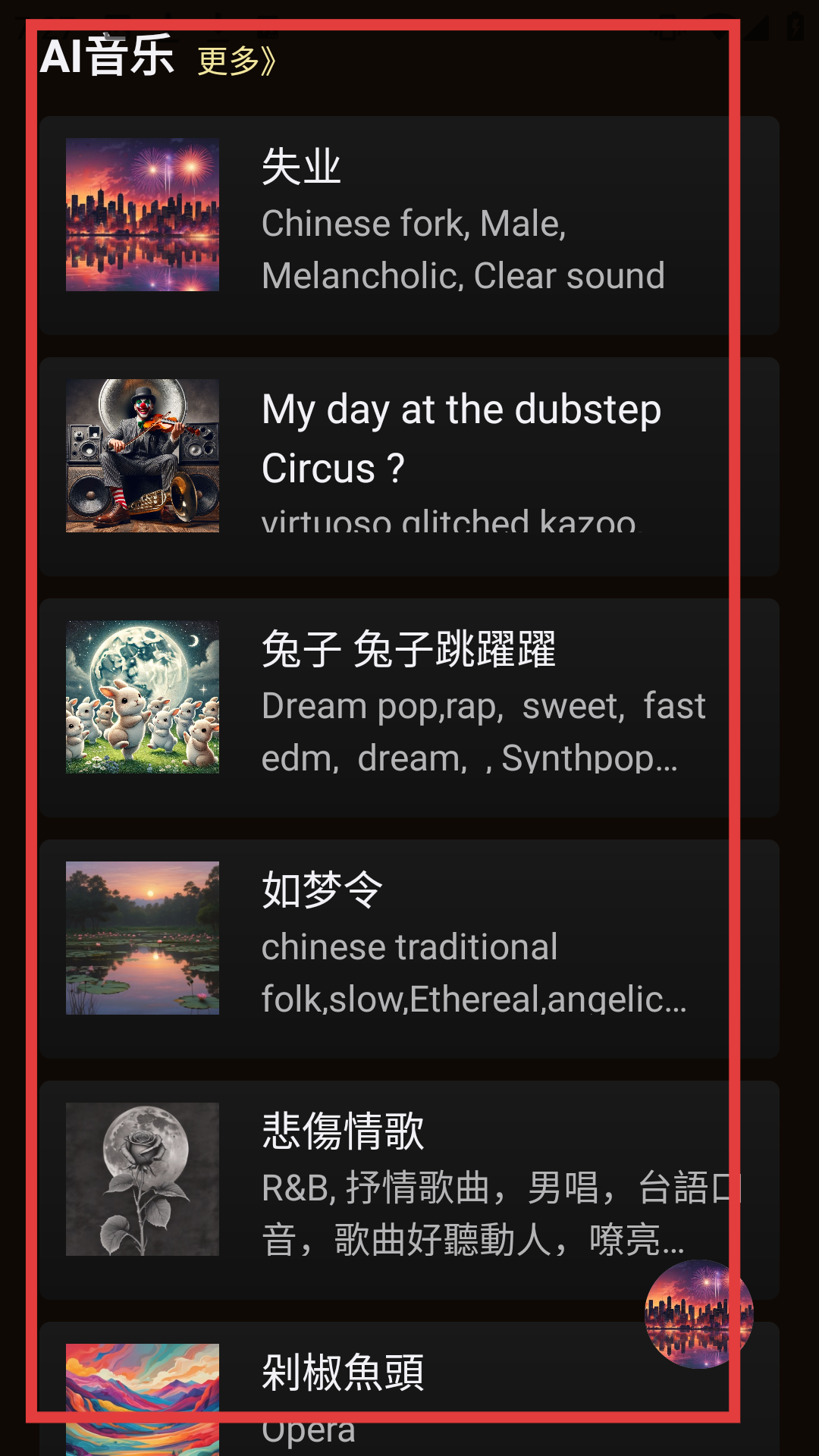 1、可查看AI音乐推荐列表,里面有不同风格的歌曲,像带有忧郁感、清晰男声的中国风歌曲等,能快速找到感兴趣的音乐。