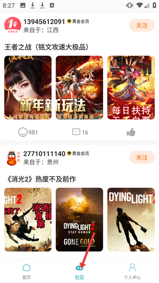 3、社区板块可看到其他玩家分享的王者之战宣传、消光2热度讨论等内容,支持点赞、评论、分享,还能发起自己的帖子,与同好互动交流。