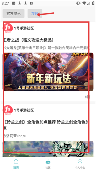 2、切换到攻略板块,可查看大屠龙、铃兰之剑等游戏的玩法、角色加点、装备搭配等攻略,还能收藏常用攻略方便日后查阅,快速提升游戏技巧。