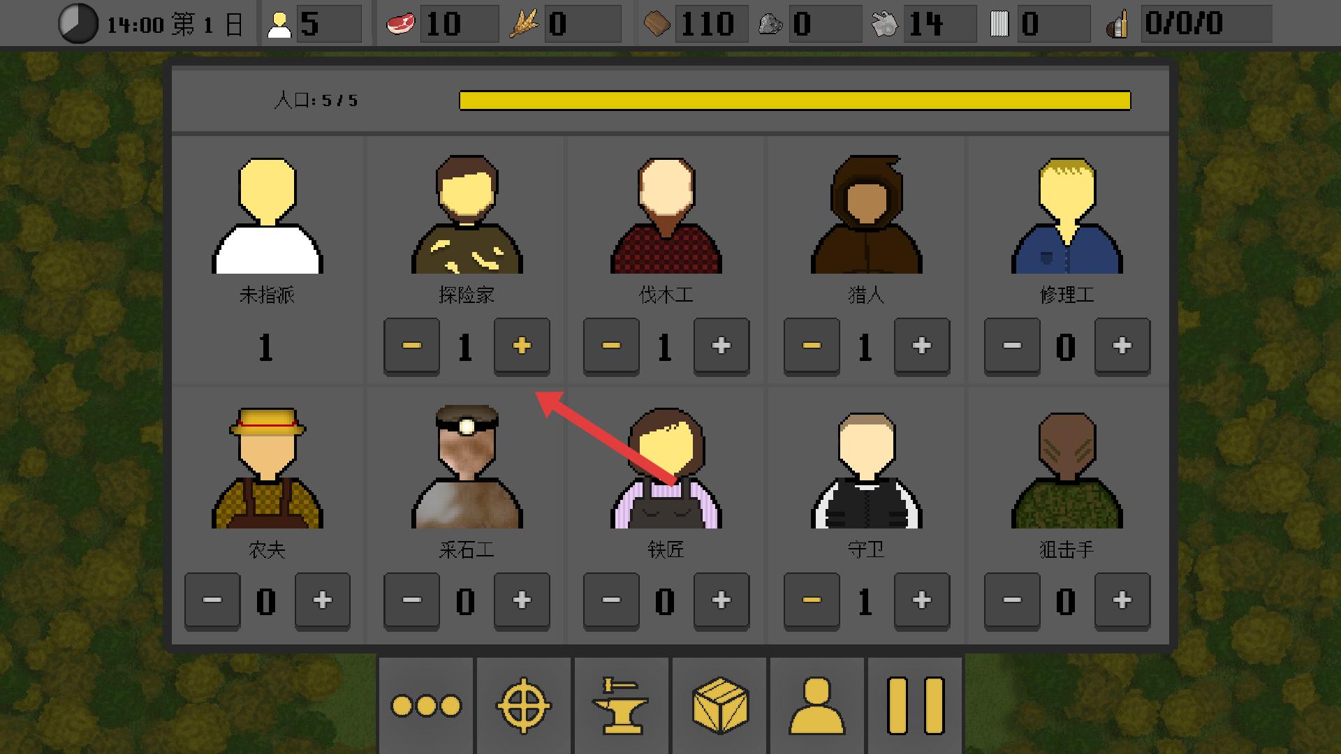 4、最后点击人员分配相关按钮,进入人员界面,根据营地发展需求,调整不同职业的人员数量,合理分配人力。