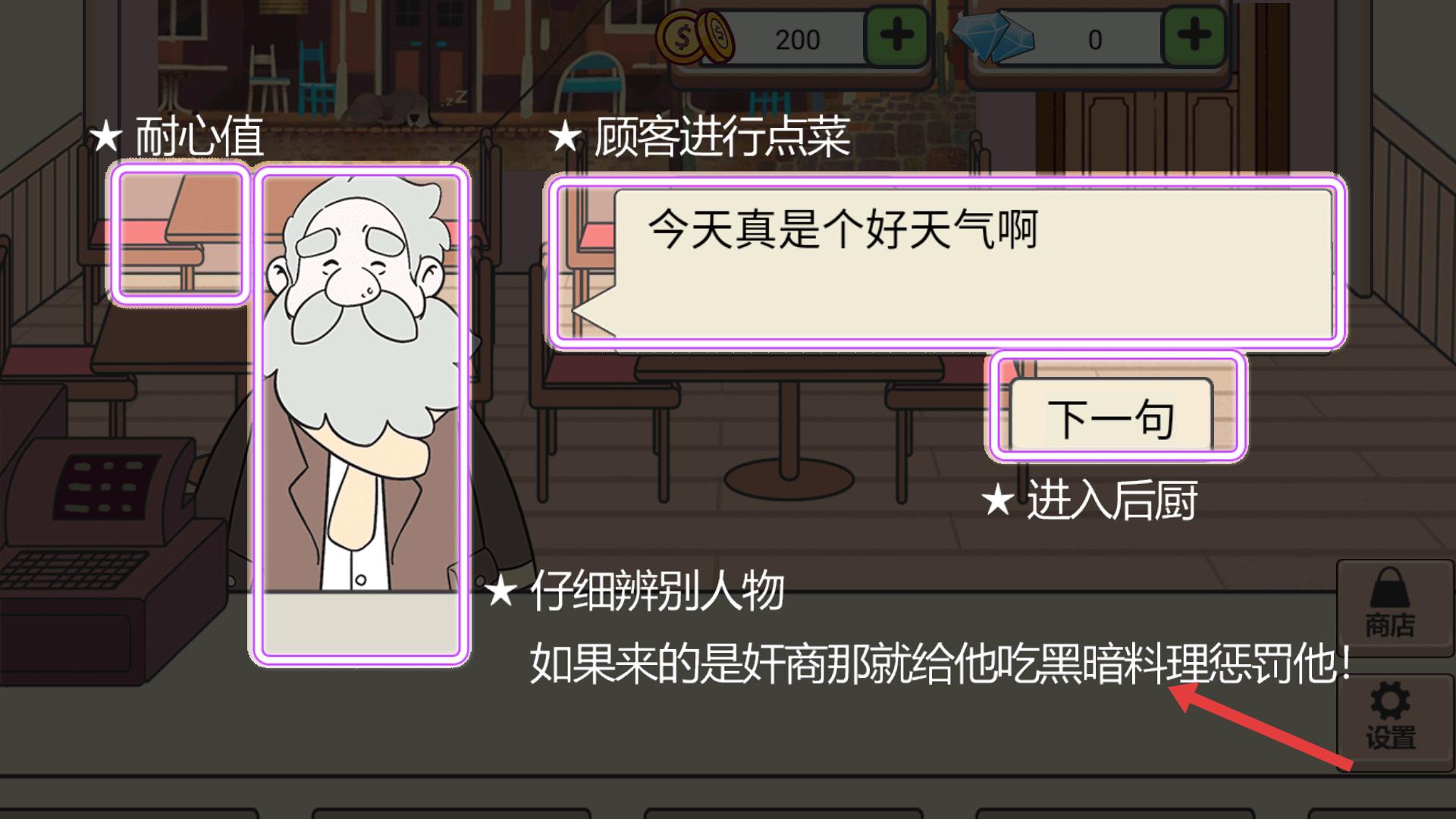 1、仔细辨别人物,根据顾客类型决定菜品,若遇到奸商则制作黑暗料理惩罚,同时留意顾客耐心值。