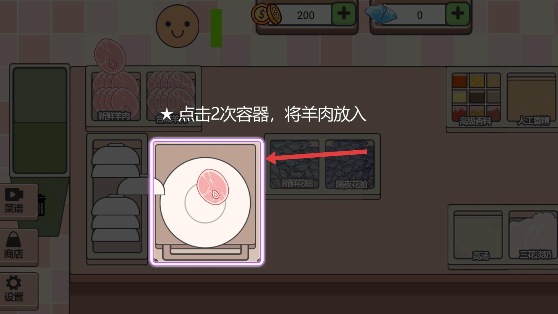 2、顾客点菜后进入后厨,按照提示点击容器,将食材放入,为制作菜品做准备。