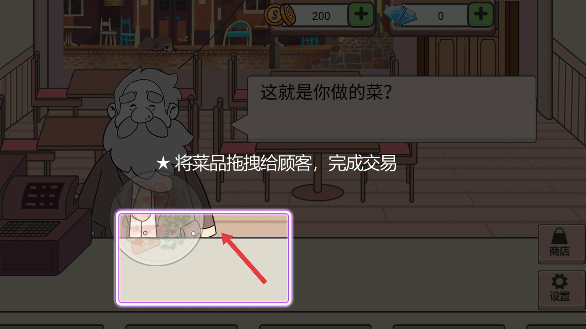 4、菜品制作完成后,将其拖拽给顾客,完成交易,获取相应的金币等奖励。