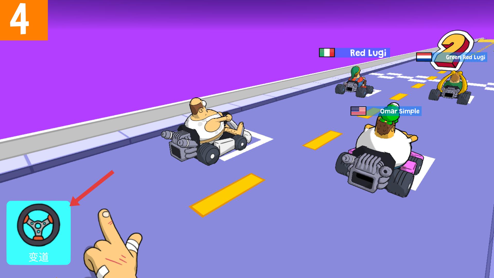 2、比赛中点击变道按钮,切换赛车行驶车道,避开其他赛车,保持行驶节奏。