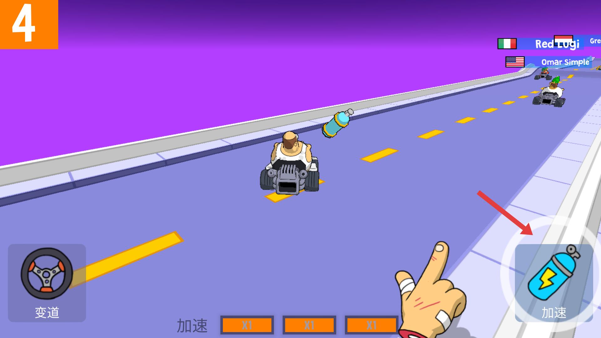 3、遇到加速道具时点击使用,提升赛车速度,在赛道上快速超越其他对手。