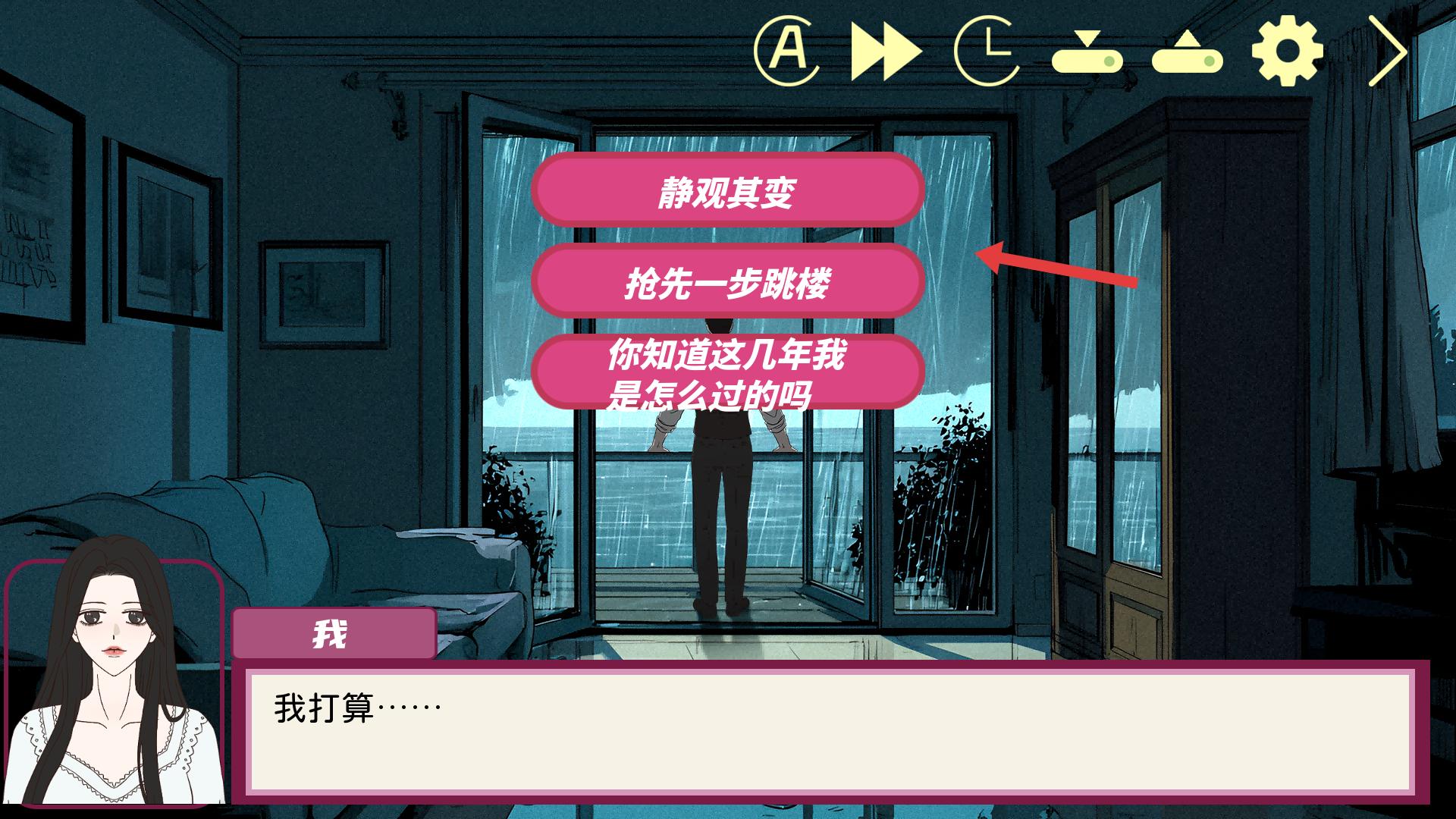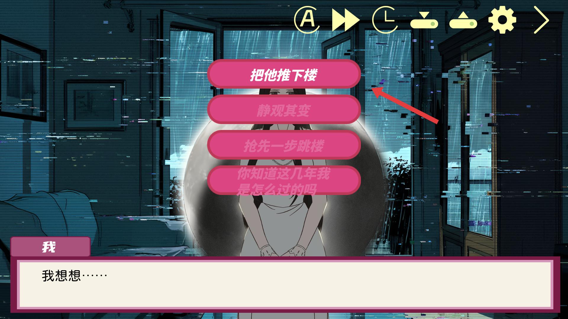 3、在后续的选择中尝试新的选项,如把他推下楼等,触发新的剧情和场景变化。