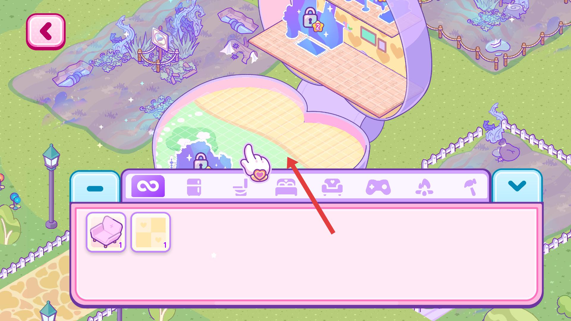 4、将挑选好的家具放置到爱心建筑的不同区域,根据自己的喜好规划布局,不断装饰空间,打造独特的家园。